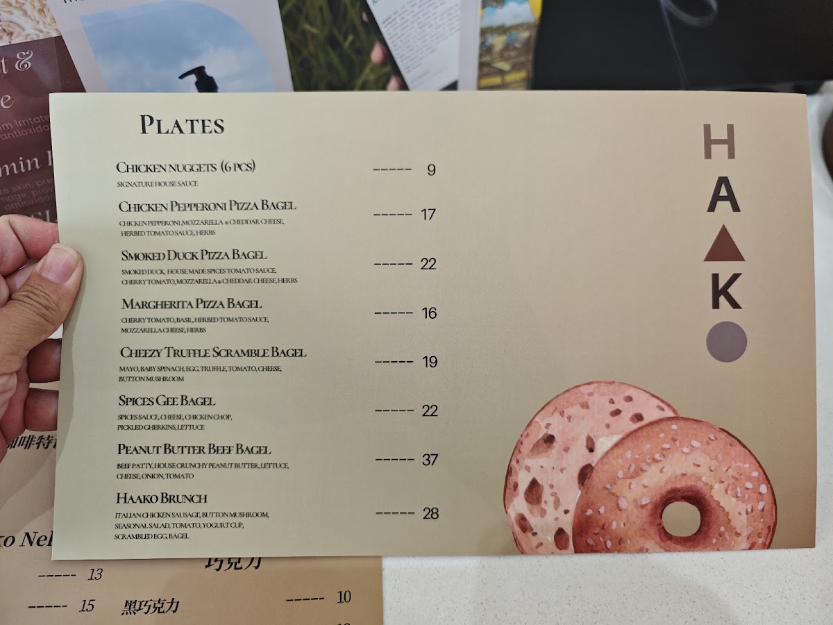 In addition to drinks, the menu includes light meals and desserts. Common offerings include items such as bagels and tiramisu, providing options for those looking for light bites or a sweet accompaniment to their beverages.