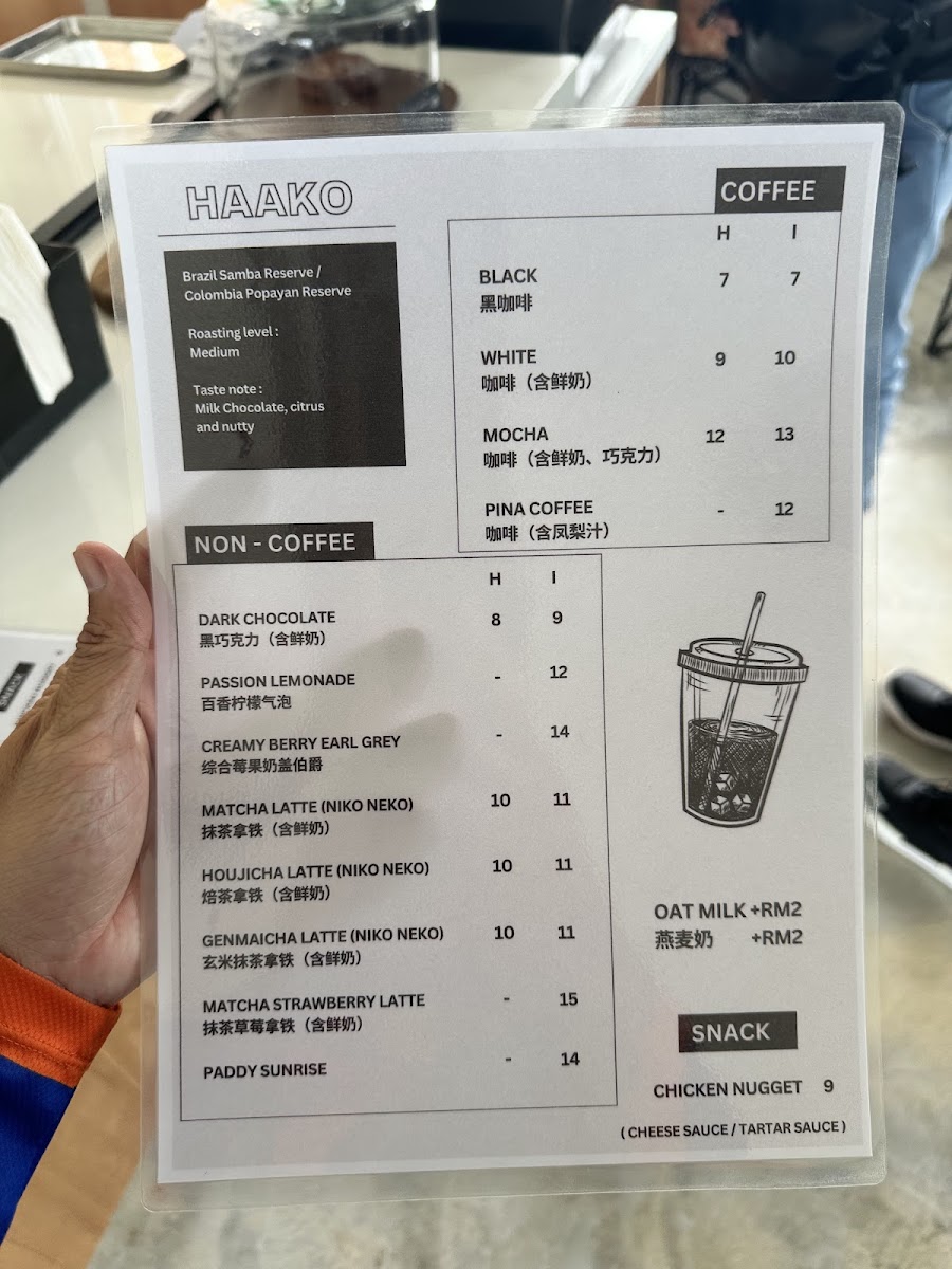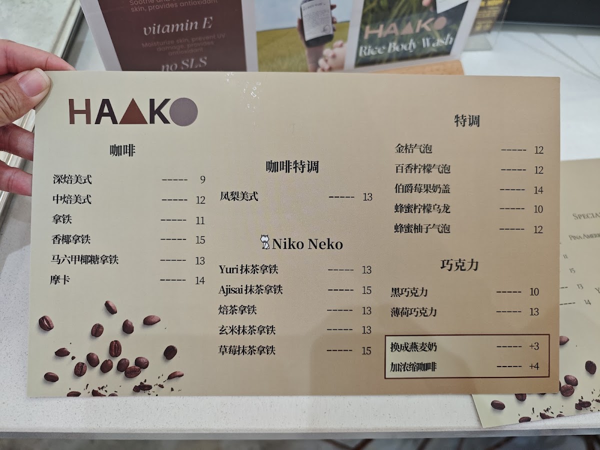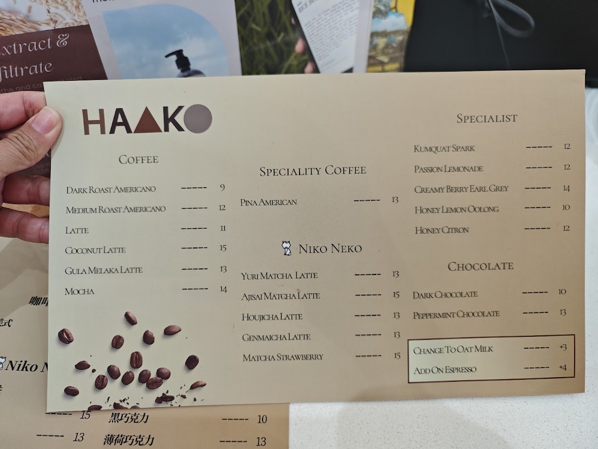The menu at Haako 壹號溝 primarily features a selection of beverages and light food items suitable for coffee breaks and casual dining. Visitors can expect a variety of coffee options, including Americano and specialty drinks such as Matcha Latte. Alongside coffee, there are other drink choices like lemonades and hot chocolate.